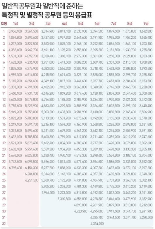 일반직공무원의 봉급표를 보여드리겠습니다.