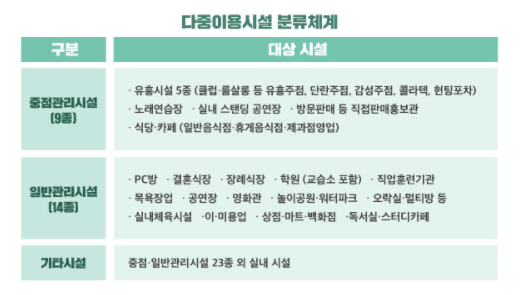 방문판매나 노래연습장, 실내공연장 같은 경우에는