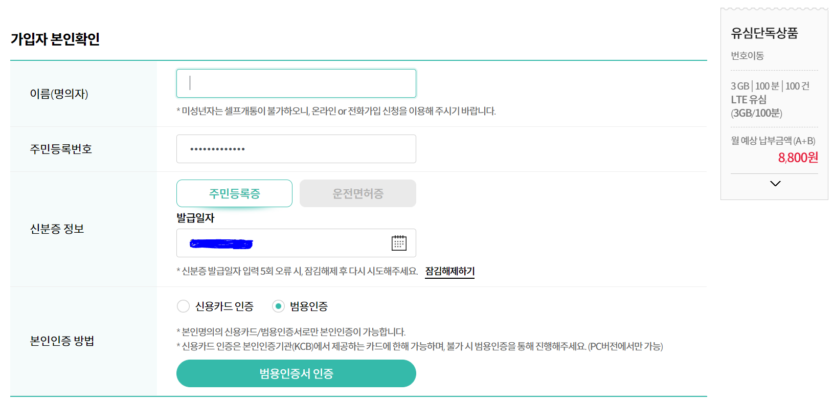 이름, 주민등록번호, 신분증의 정보를 기재하고