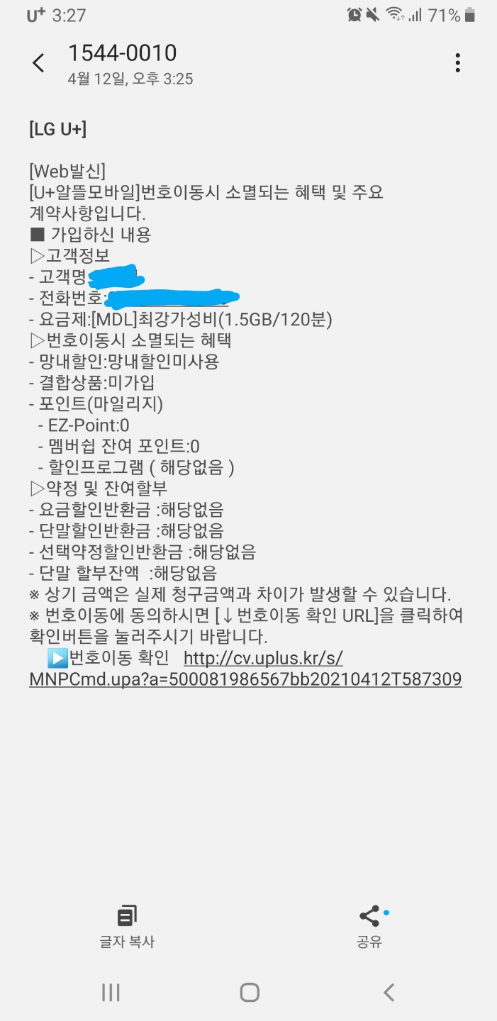 타 알뜰폰 요금제로 번호이동을 하였습니다.