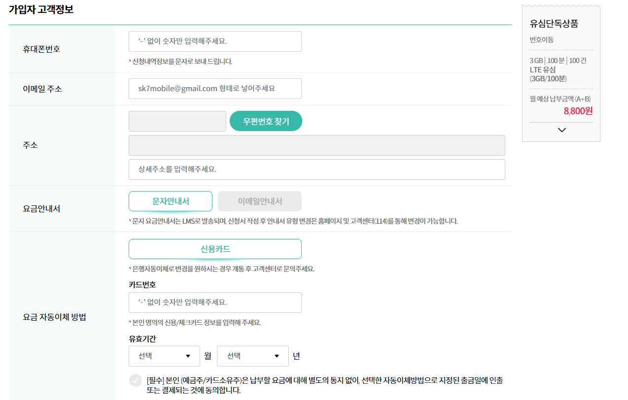 그리고 가입유형은 번호이동과 신규가입 중 선택해줍니다.