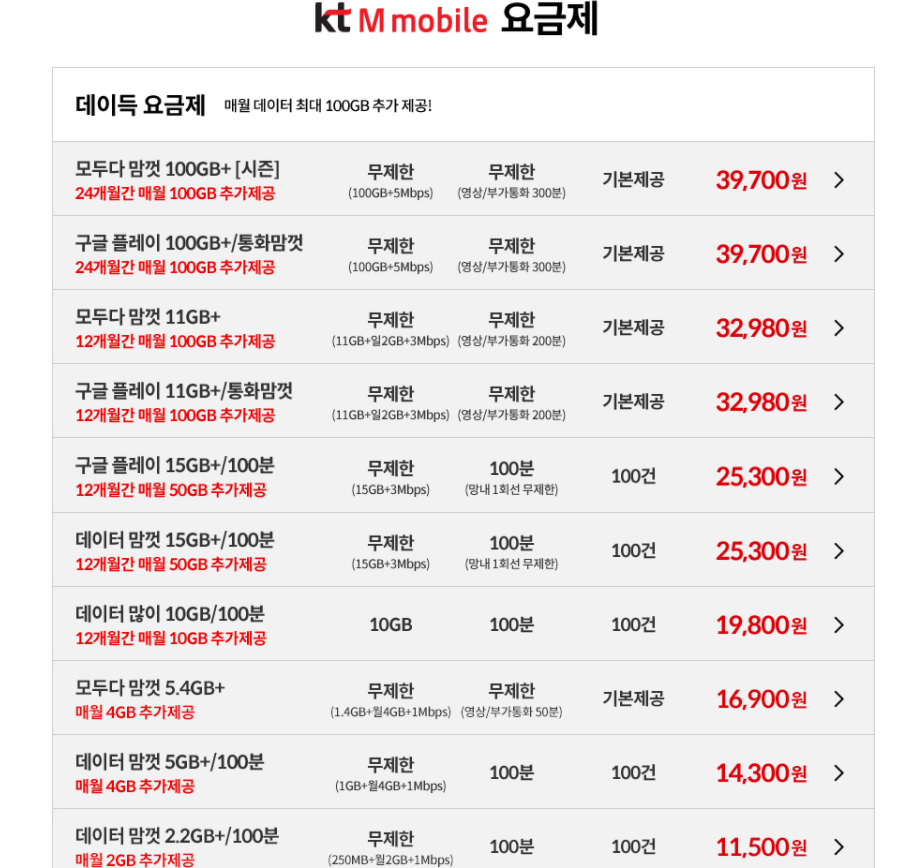 오른쪽은 kt m모바일의 요금제입니다.