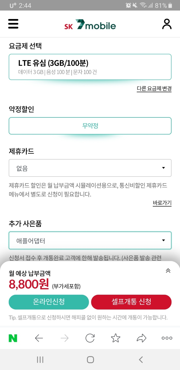 먼저 sk세븐모바일 알뜰폰 요금제 신청에는