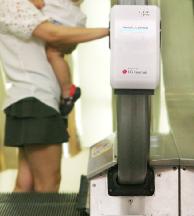 에스컬레이터에 부착된 이 자가발전식 자외선 살균기를