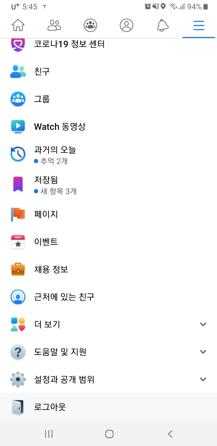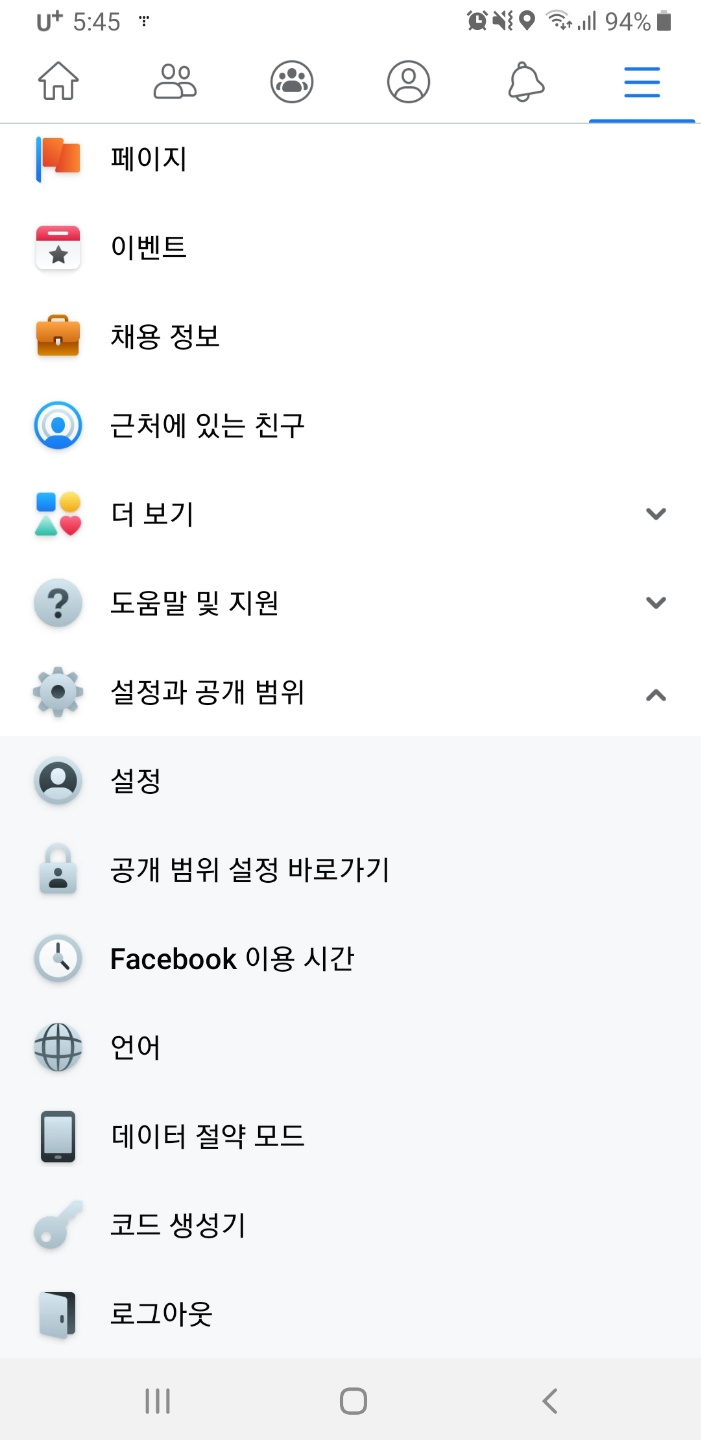먼저 모바일 페이스북 어플 화면으로 가장 오른쪽에