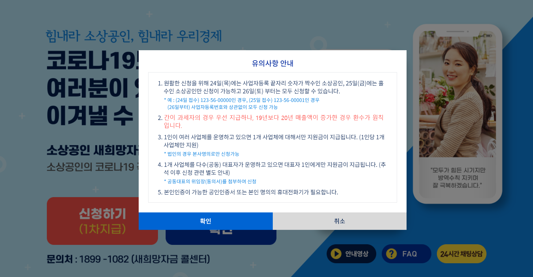 신청하기 창을 누르면 뜨는 유의사항을 확인하고