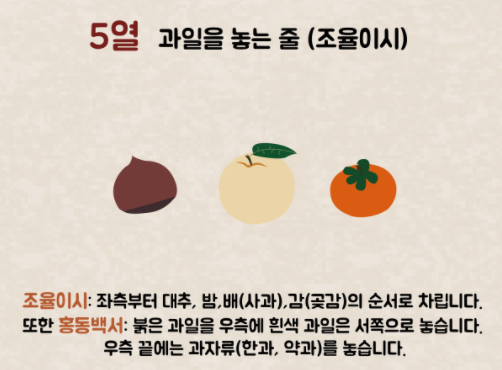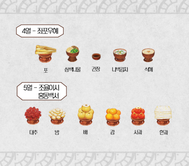 넷째 줄에는 포와 식혜를 놓는데 '좌포우혜' 원칙에 따라