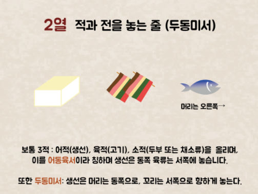 둘째 줄에는 적과 전을 놓는데 이때 육류는 왼쪽,