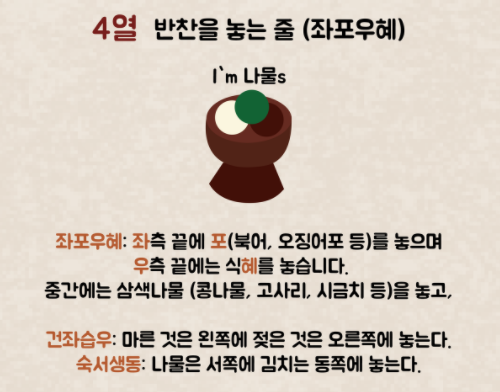 넷째 줄에는 포와 식혜를 놓는데 '좌포우혜' 원칙에 따라