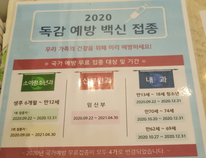 올해는 3가 독감주사는 없어지고 무료 예방접종이