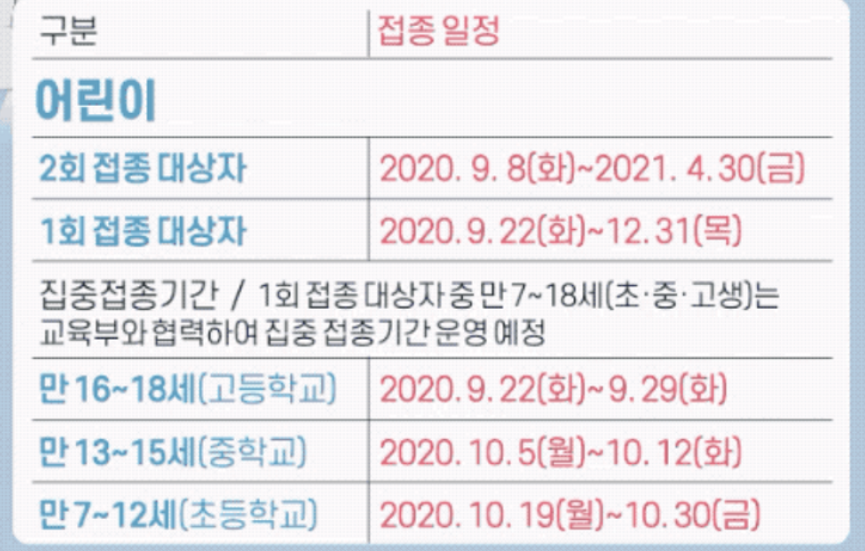 1회 접종은 2020년 9월 22일부터2020년 12월 31일까지,