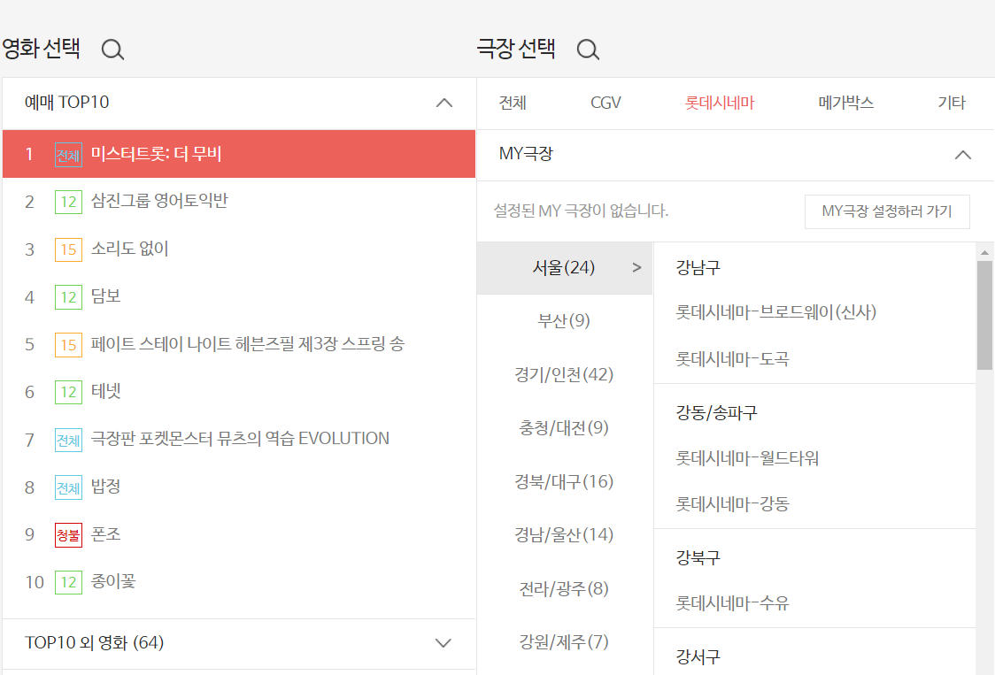 예매하기 버튼을 누르면 미스터트롯 더 무비를