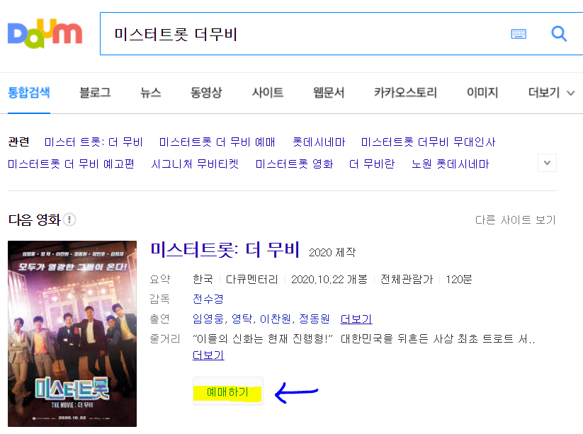 예매방법은 검색창에 미스터트롯 더 무비를 검색하고